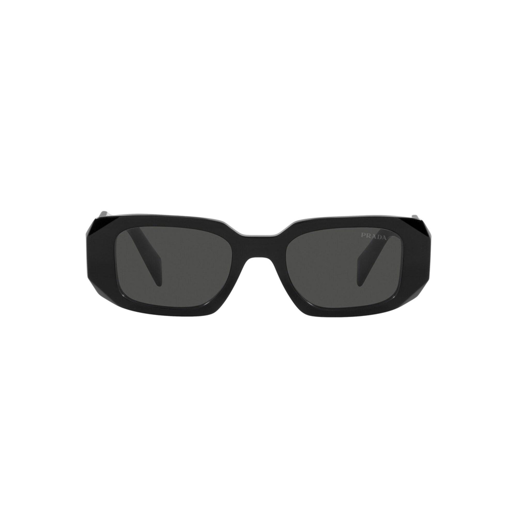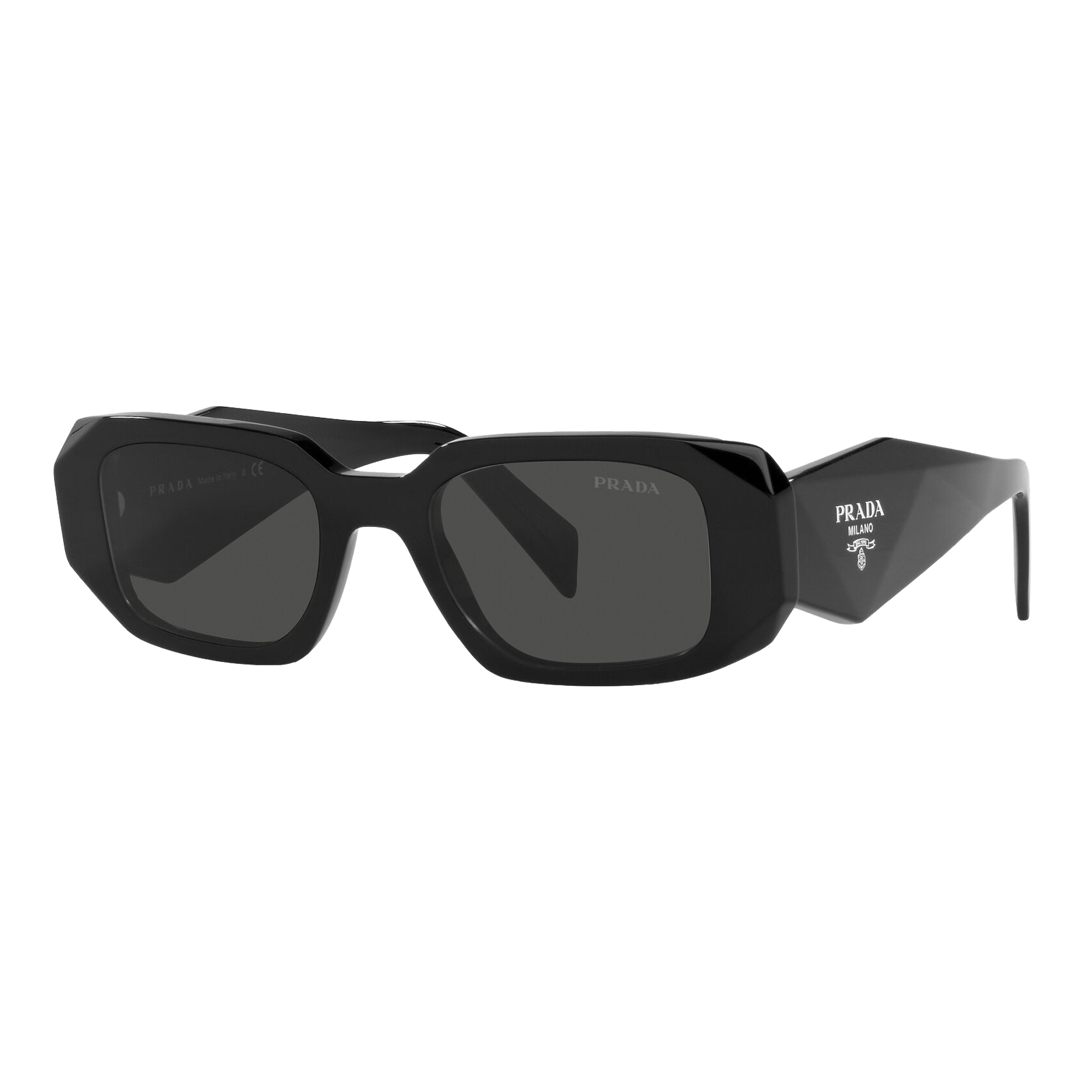 Acetate sunglasses with an oversized, geometric design. The bold frame front has an avant-garde silhouette defined by the extreme angled cut of the outer corners. The three-dimensional design of the temples is decorated with an iconographic interpretation of the traditional Prada triangle logo. Eye size: 49; Frame: Black; Lens: Dark Grey; Lens Material: Standard Plastic
