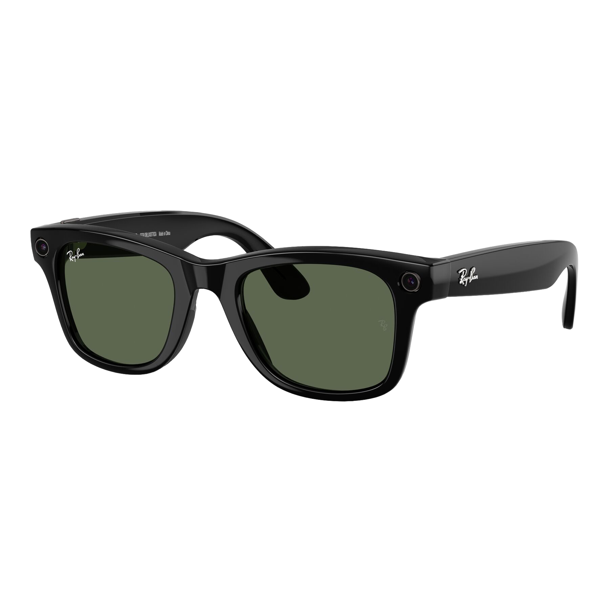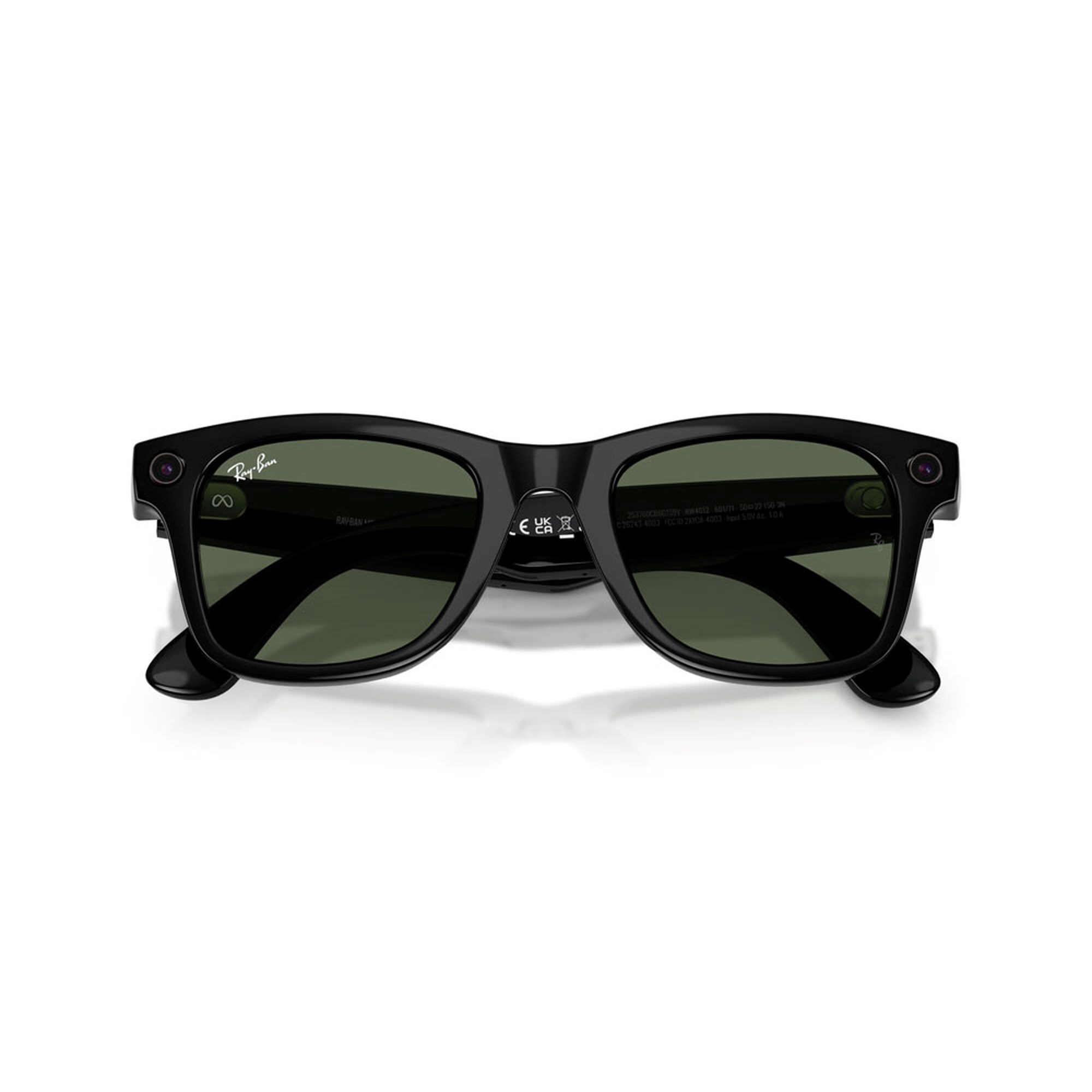 Iconic frames that stop a room, and technology that lets you move effortlessly through it. A style pioneer from Hollywood to hip-hop, the Wayfarer never stands still. Forever embraced by the next generation of culture makers, now its journey continues with advanced Meta AI. Capture photos and videos, listen to music and podcasts, make a call, translate in real time, even send a text on the fly - all without taking out your phone. Eye size: 50; Frame: Shiny Black; Lens: G-15 Green; Lens Material: Standard Plastic