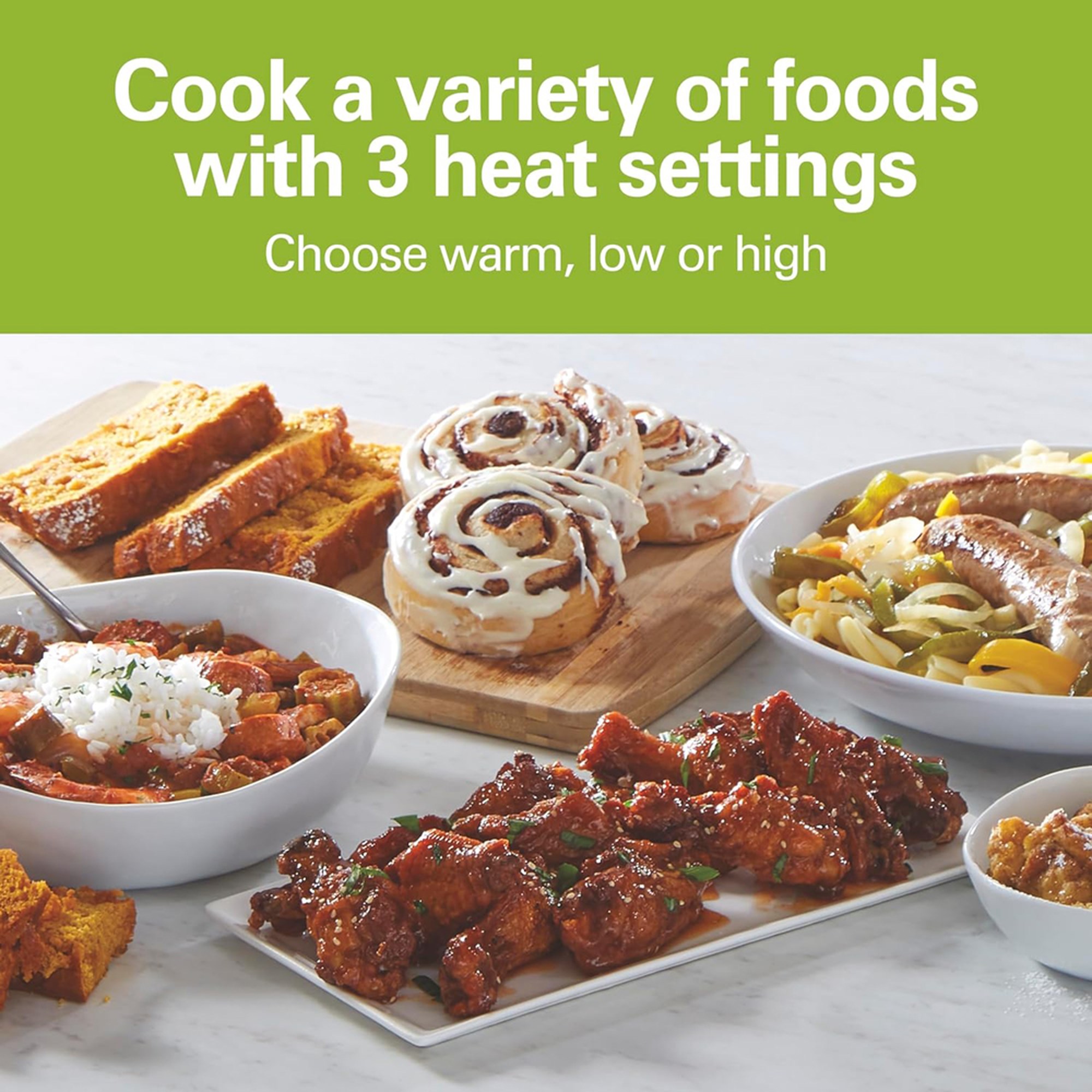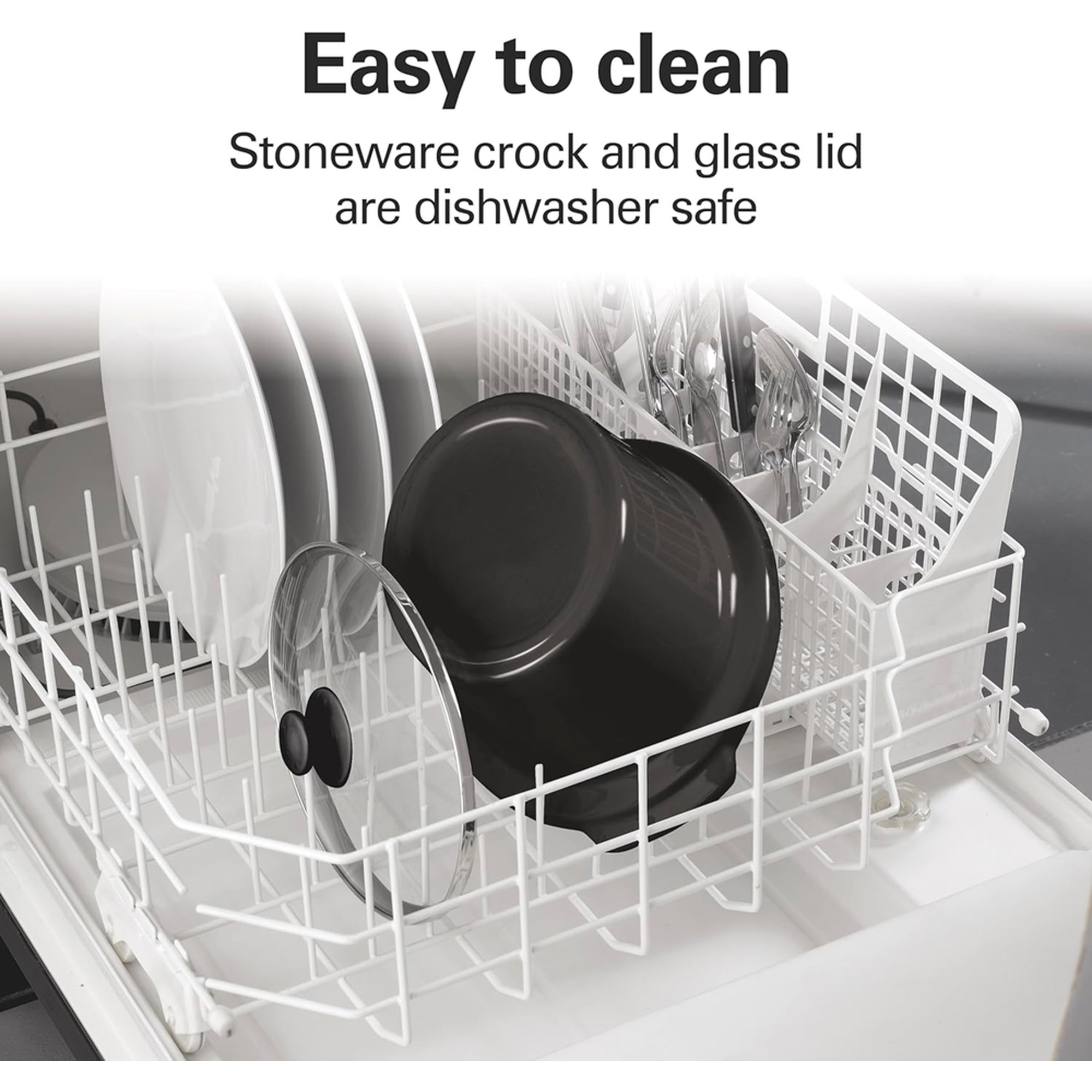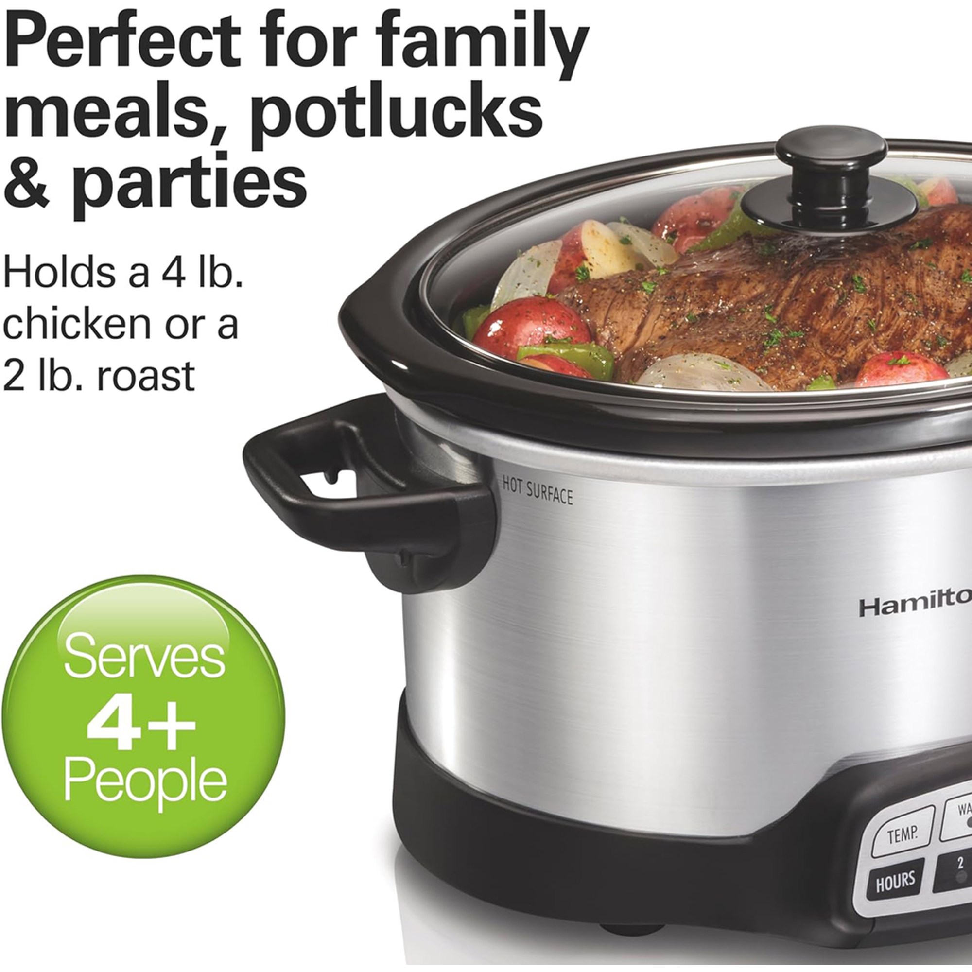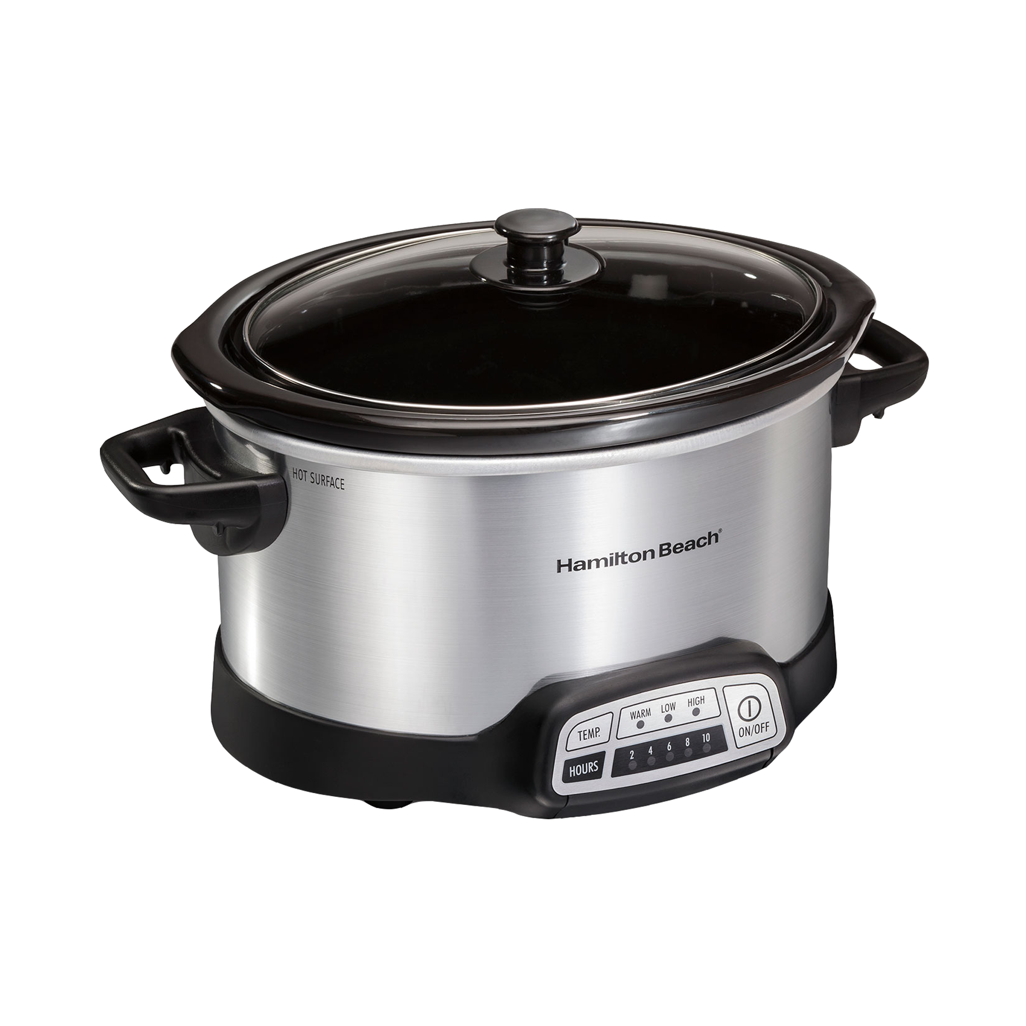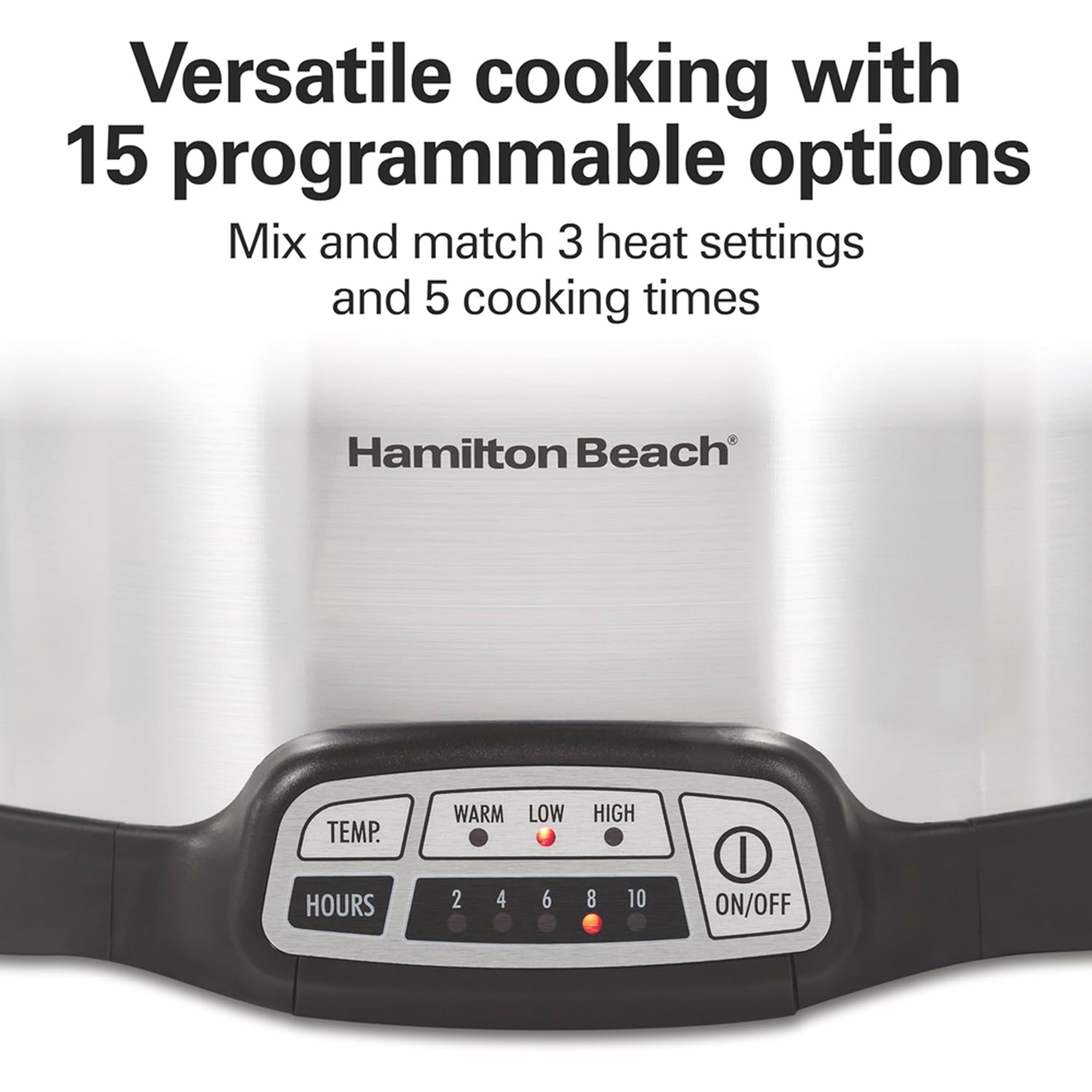 With the Hamilton Beach Programmable Slow Cooker, making a delicious, home-cooked meal is as easy as putting a few ingredients in the crock and turning it on. And with flexible programming options, this slow cooker gives you the ultimate selection of temperature and cooking time combinations. Once cooking time is up, the slow cooker automatically switches to warm. When you're done, both the lid and crock remove easily and can go into the dishwasher for cleanup.