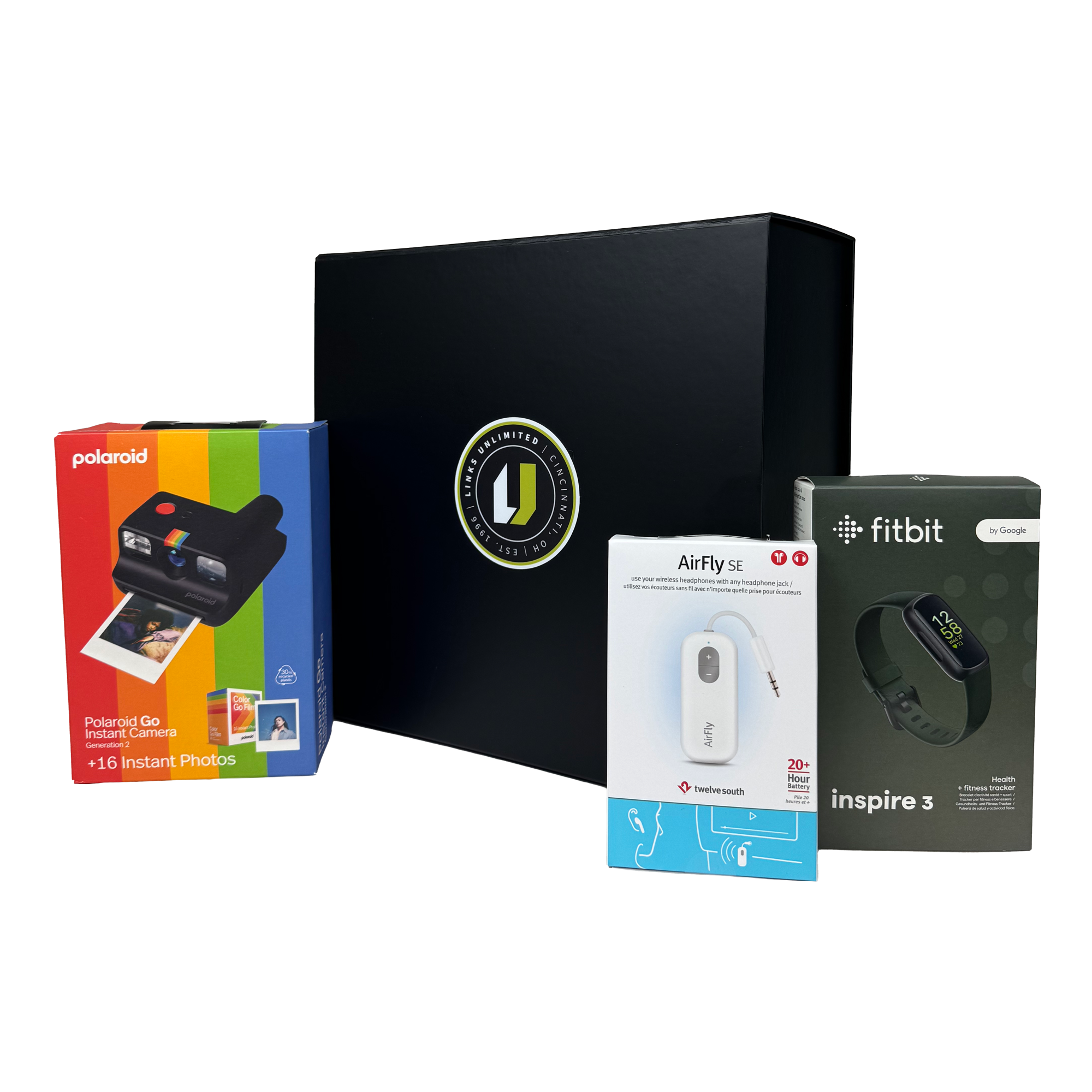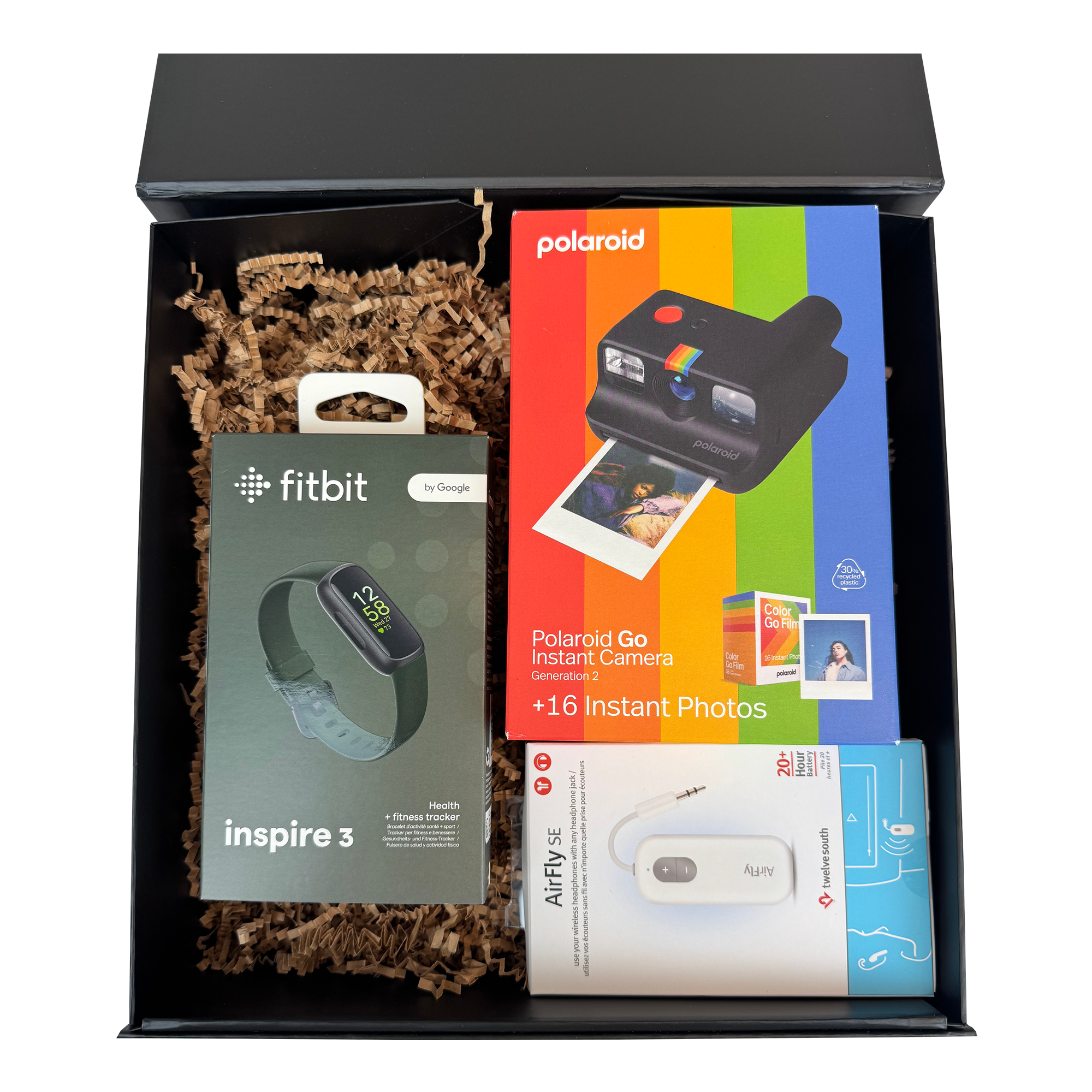 This meticulously curated kit is designed for the professional who seeks both adventure and style. Inside, you'll find a Polaroid Go Camera to capture every moment, a Fitbit to do what you love most and feel your best, and an AirFly SE from Twelve South, the most affordable way to listen to in-flight movies with your wireless headphones or earbuds. Elevate your employee, client appreciation, or executive gift with this box full of adventure!