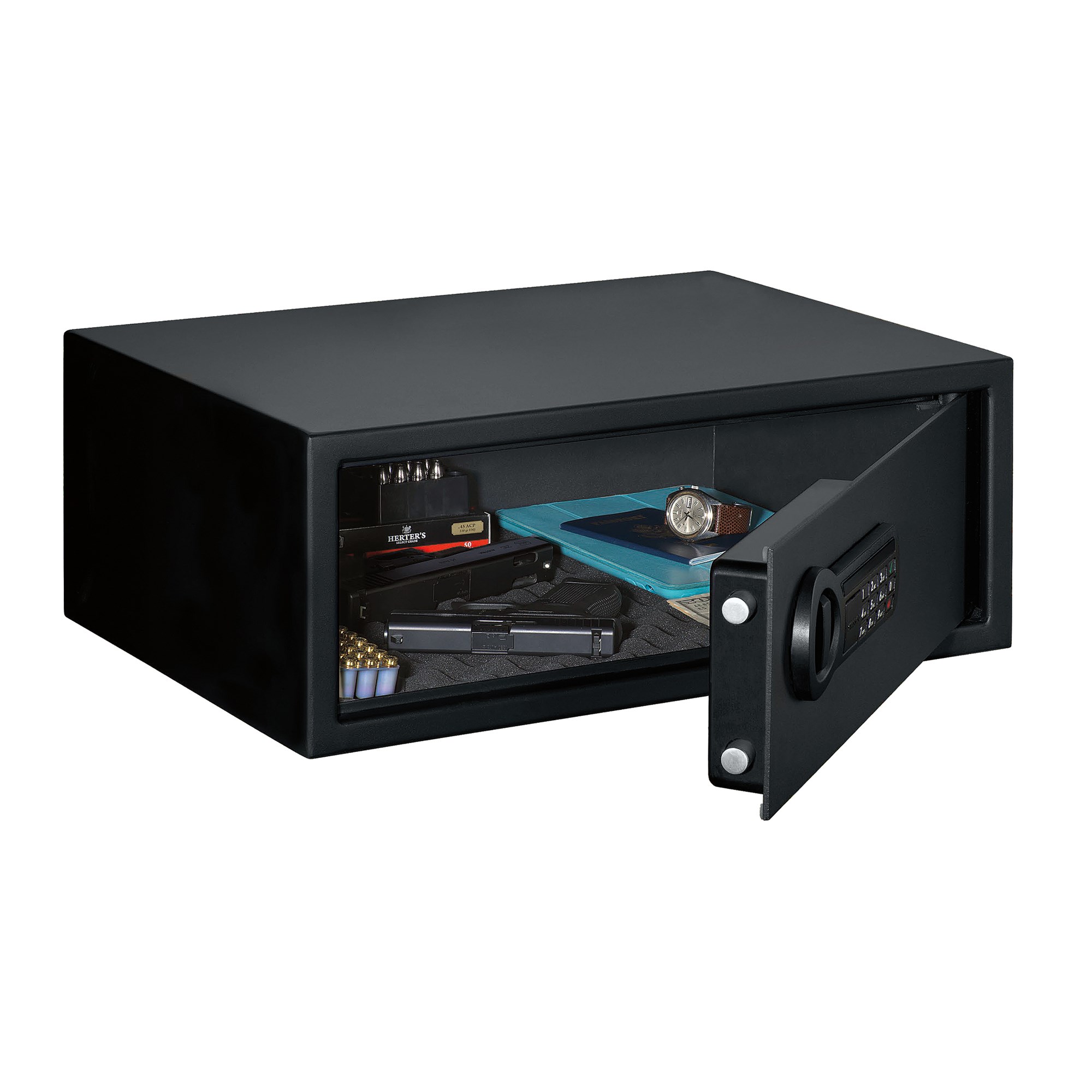 This extra-wide Personal Safe with electronic lock is sized to secure laptop computers and has plenty of space for storing valuables. The easy to use electronic lock has a large push button keypad that accepts a personalized 3-8 digit code, two backup keys are included. The solid-steel, pry-resistant door has concealed hinges and 2 steel live action locking bolts. It also has a foam padded bottom to protect valuables from scratches. External Dimensions: (WxDxH) 20.5" x 14.75" x 8". Internal Dimensions: (WxDxH) 20.25" x 12" x 7.5"