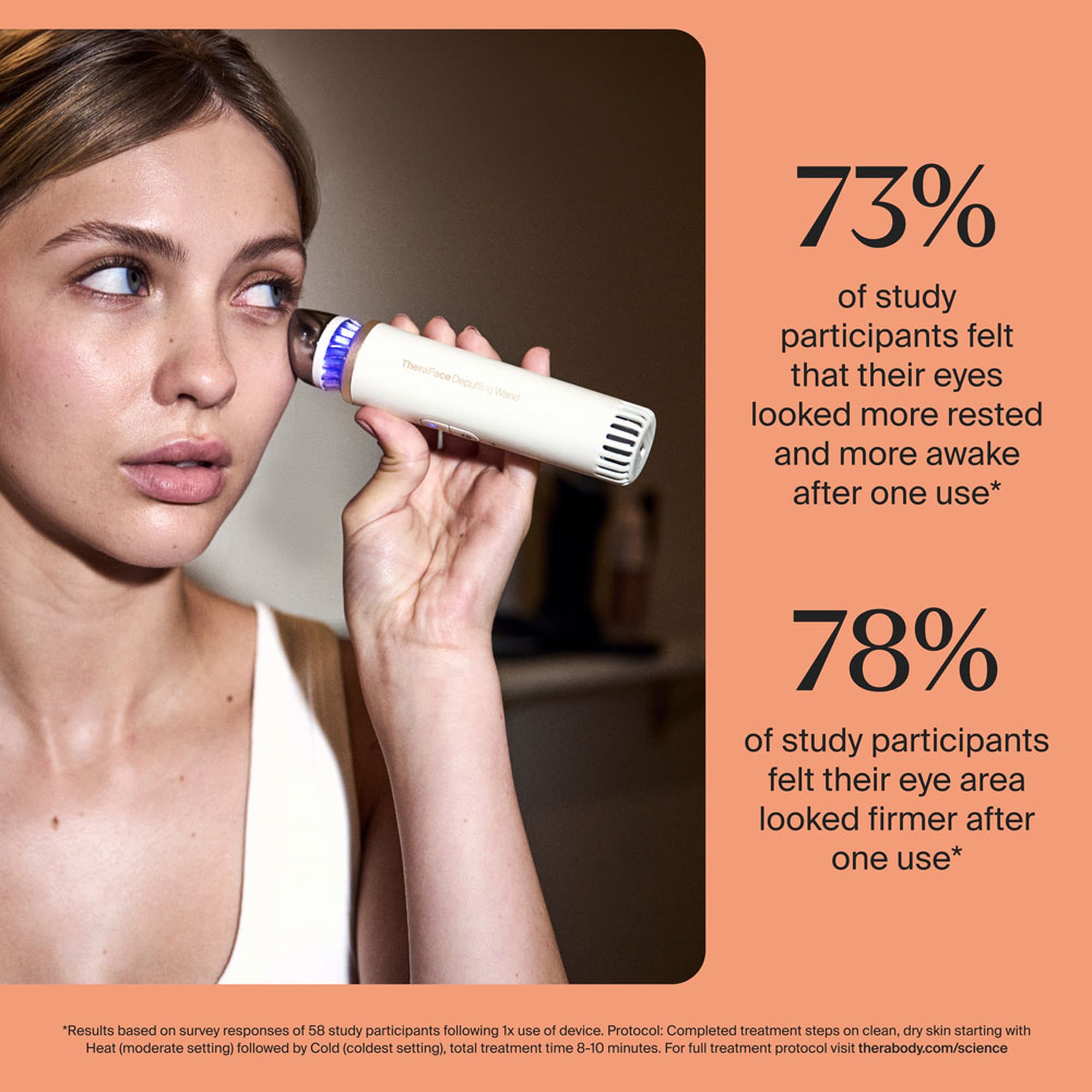 Depuff and glow anytime, anywhere with the TheraFace Depuffing Wand. This portable skincare device offers both cold and heat facial treatments, shown to reduce under-eye puffiness, improve elasticity, and enhance skin radiance. It delivers science-backed temperatures that are safe for delicate skin, ensuring consistent and reliable results across your entire face. Choose from 3 preset temperature levels suitable for all skin types.